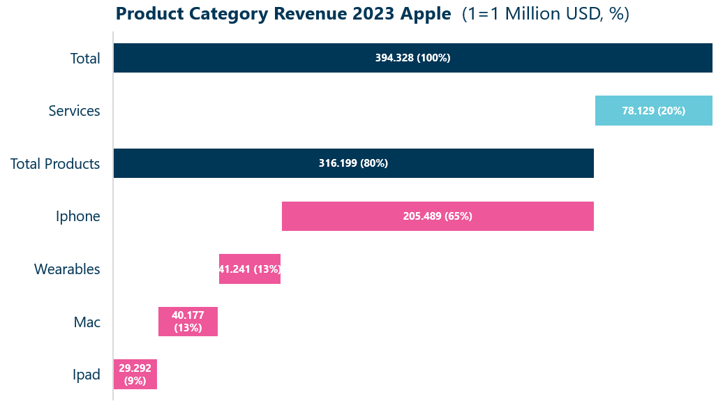 These charts are often used to show how a cumulative total is made up and then goes to show how to break them down in smaller parts. In our example it shows how Apples total revenue in 2023 is divided among services and products.